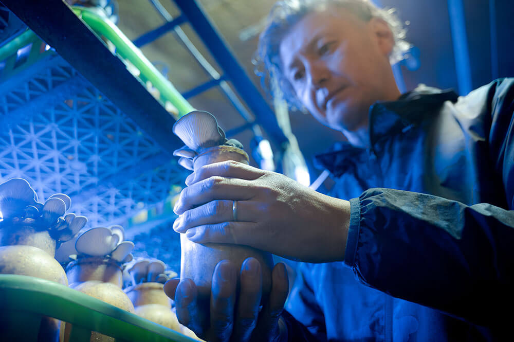 殺菌した培地に一つずつ丁寧に植菌。その後、温度・湿度・CO2濃度等を細かく管理しながら約45日間かけ培養を行います。菌がしっかりと回ったことを確認した後、芽出し作業を行い、栽培室へ。ここでも約10日間発芽・生育に適した温度・湿度・CO2濃度を毎日朝昼夜とチェックし、黒あわび茸の成長に合わせて調整を行います。