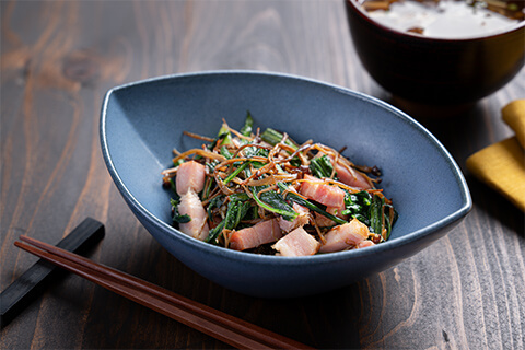 春菊と乾燥ブラウンえのきのベーコン和え