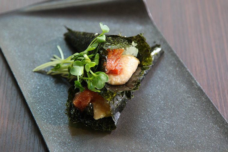 2. 海苔の上にご飯をのせ、ディップソースとたたき梅、キュウリなどをのせて巻く。