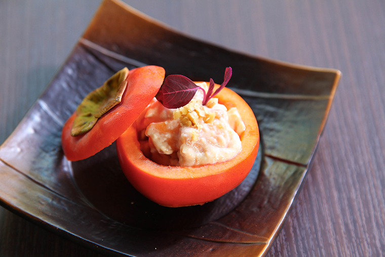 2. カットっした柿と①を混ぜ合わせ刻んだクルミをのせる。